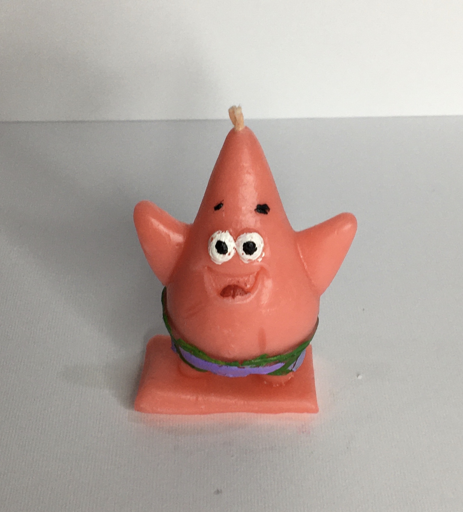 شمعی دست ساز با طراحی فانتزی به شکل عروسک های پاتریک و باب اسفنجی ، مناسب برای تزئین فضاهای شاد و کودکان .