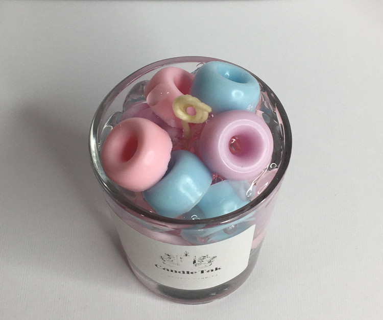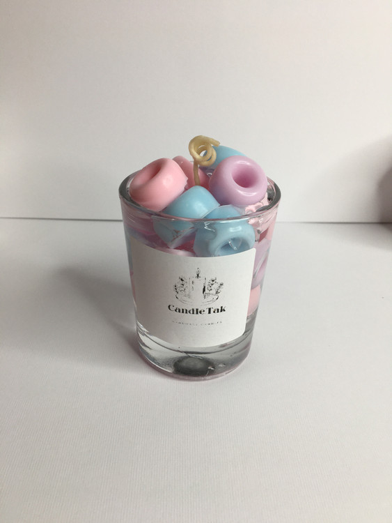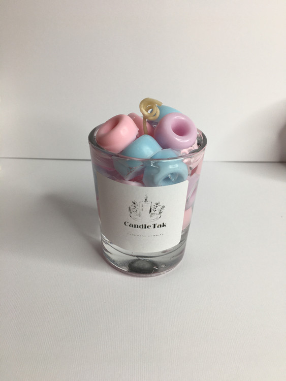 شمعی دست ساز با طراحی فانتزی به شکل دونات کوچک رنگی و در ظرف شیشه ای قرار گرفته، ساخته شده باپارافین ژله ای با کیفیت بالا.