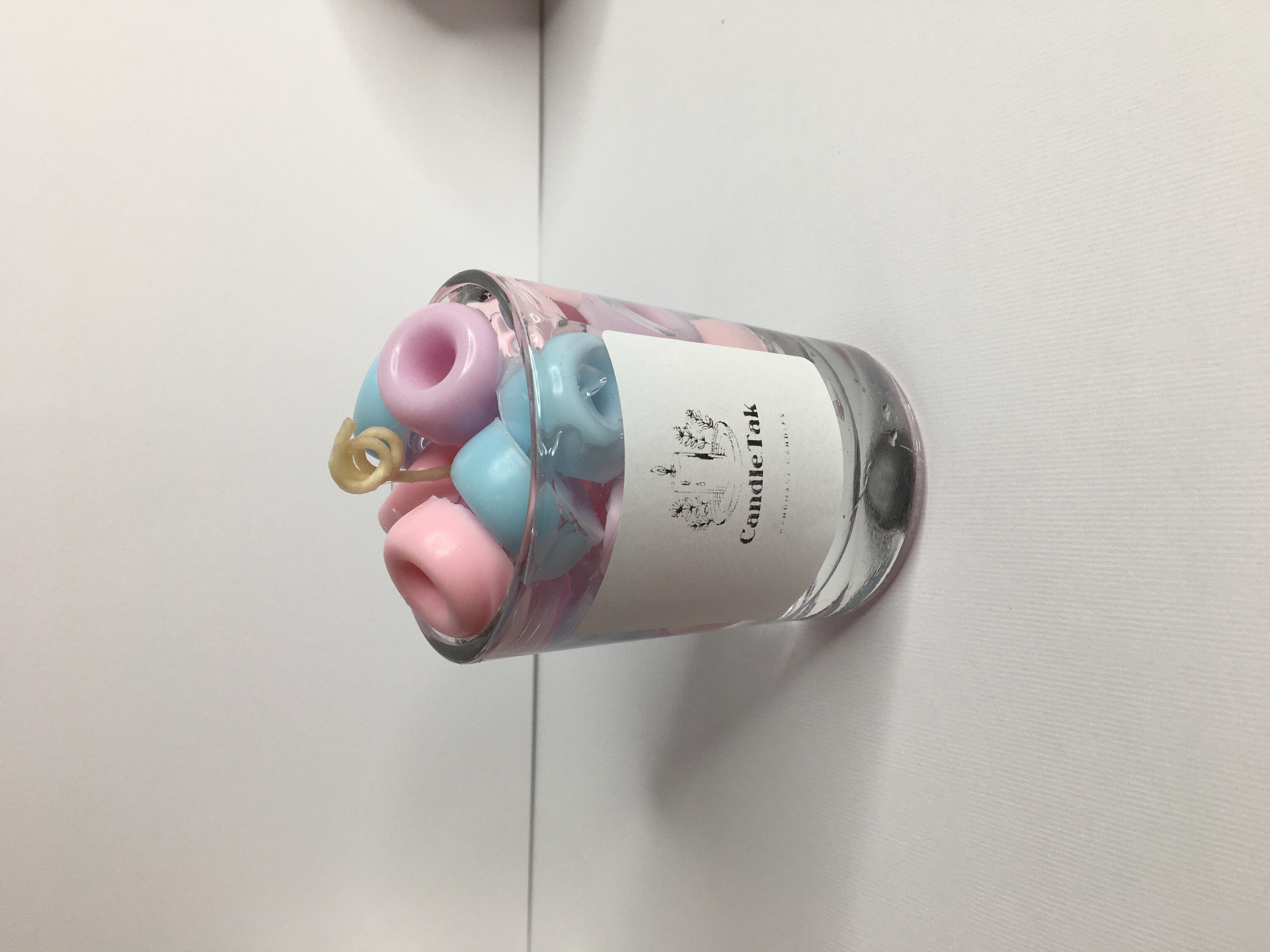 شمعی دست ساز با طراحی فانتزی به شکل دونات کوچک رنگی و در ظرف شیشه ای قرار گرفته، ساخته شده باپارافین ژله ای با کیفیت بالا.