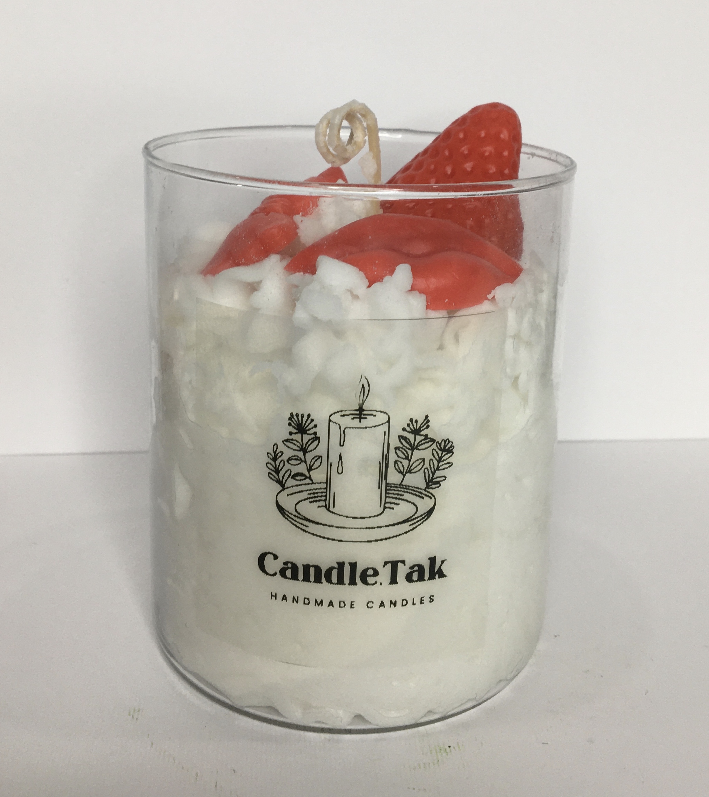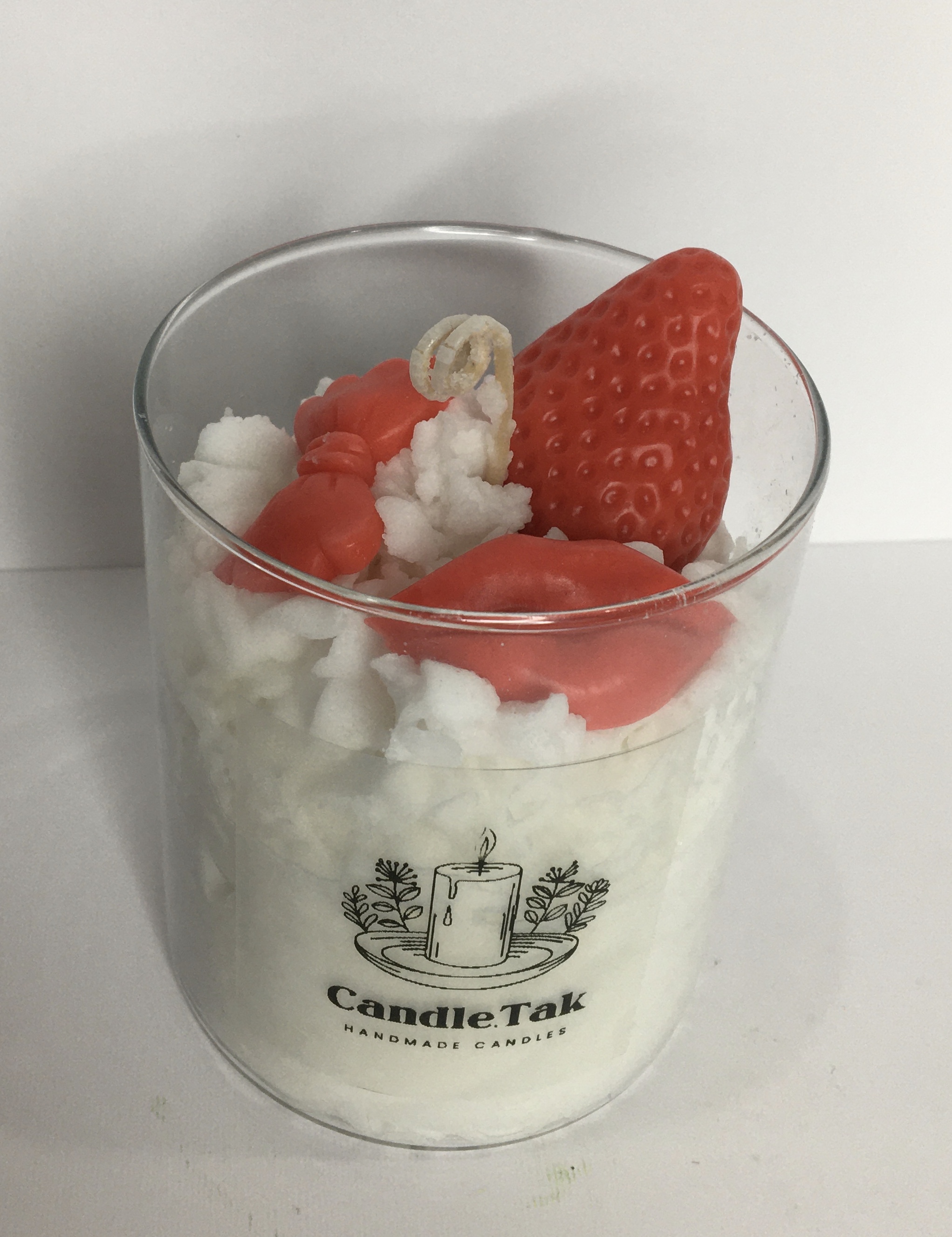 شمع عشق از شمع خامه ای با تزیینات توت فرنگی و لب و پاپیون مزین شده و مناسب برای هدیه به دوستان می باشد.